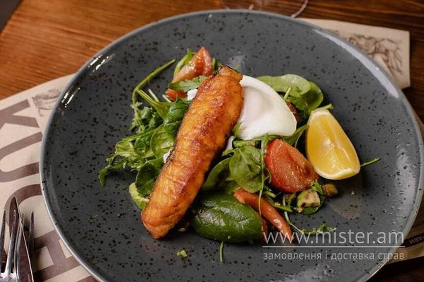 Рукола, шпинат, яйце пашот, каперси, помідор, авокадо, манговий соус.