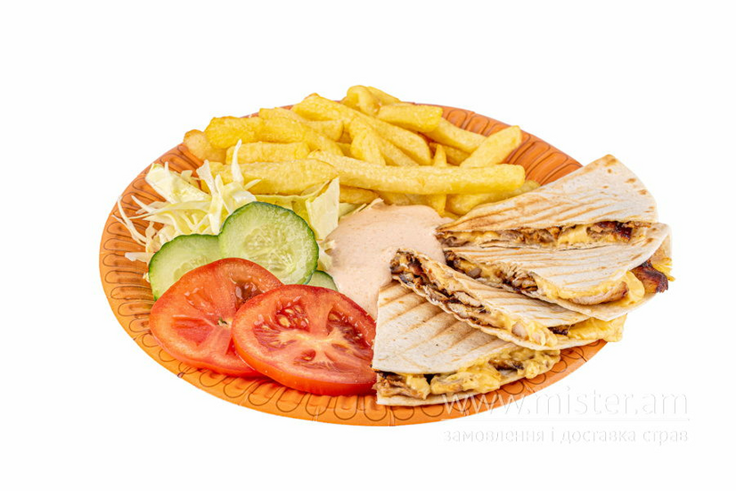 тортілья, куряче м’ясо, сир, фрі, капуста, помідор, огірок свіжий, цибуля червона, соус оливковий