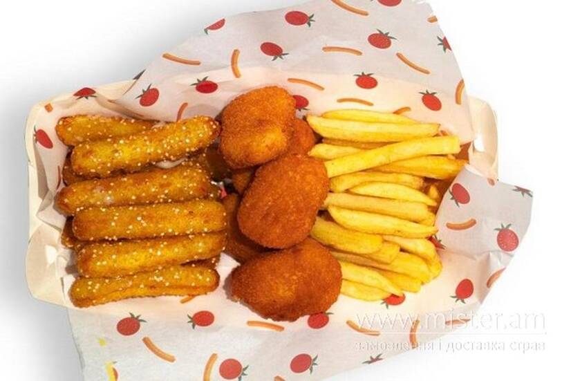 Сирні палички з Моцарелою 6 шт., нагетси 5 шт., картопля фрі 100 г.