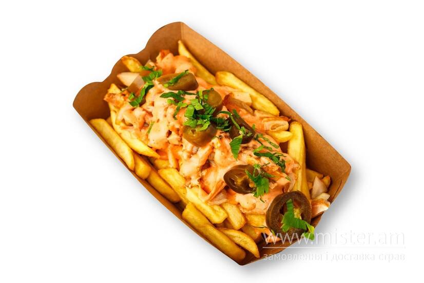Картопля фрі, куряче м`ясо, соус пікантний, маринований перець халапеньо, петрушка.