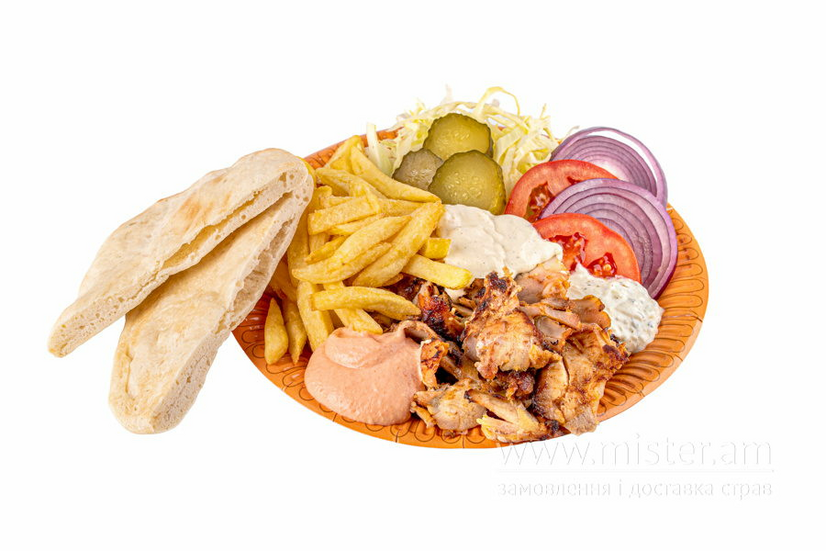 піта, куряче м’ясо, фрі, капуста, помідор, огірок маринований, цибуля червона, соус кефірний, соус оливковий, соус дзадзикі.