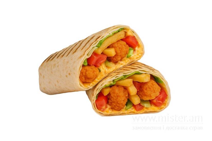 Лаваш, нагетси 4 шт. , картопля фрі, сирний соус, капуста айзберг, помідори, сир чедер, cоус манго чілі.