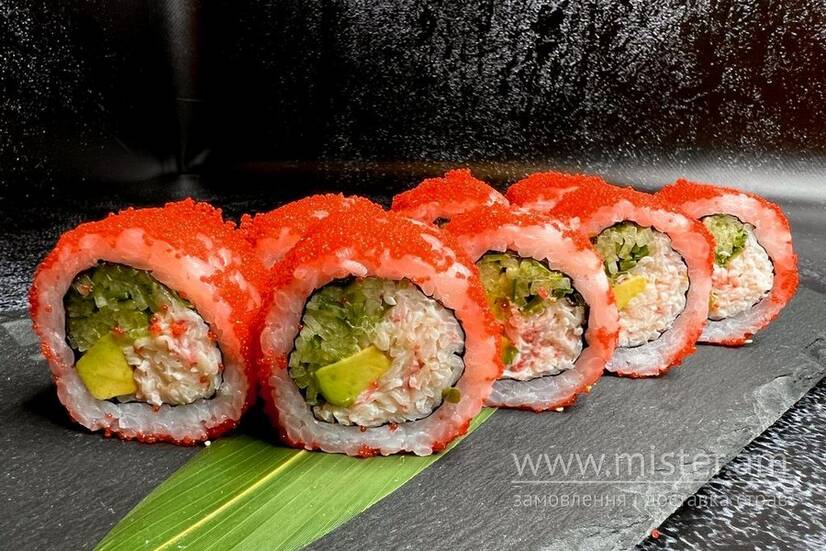 Рис, норі, ікра масаго, сніжний краб, авокадо, огірок.