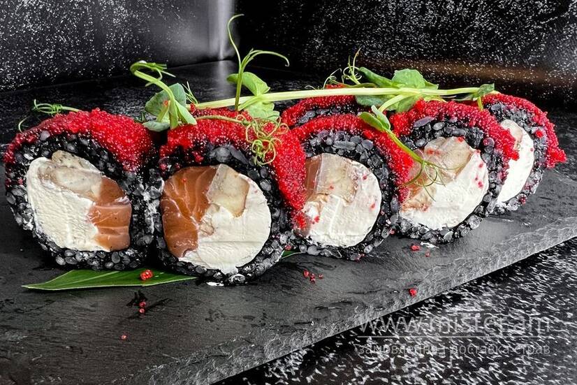 Рис, норі, сир Філадельфія, ікра масаго, чорнила каракатиці, лосось свіжий, вугор.