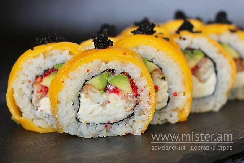 Рис, норі, сир Філадельфія, вугор, авокадо, ікра масаго, манго.