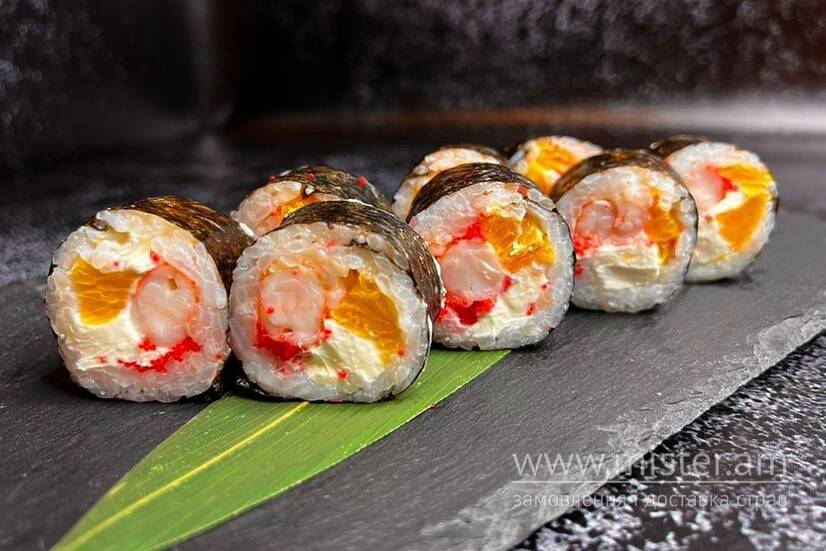 Рис, норі, сир Філадельфія, креветка, ікра масаго, апельсин.