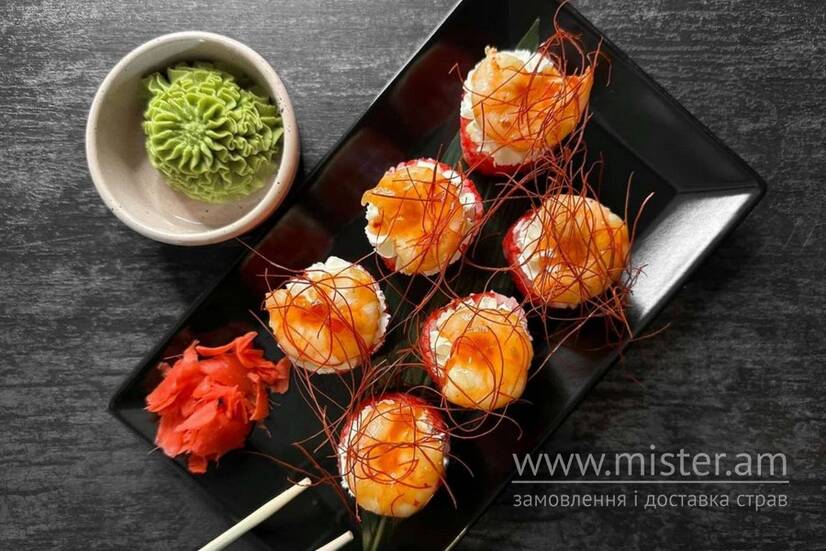 Рис, норі, сир Філадельфія, креветка, авокадо, тамаго, соус солодкий чілі.