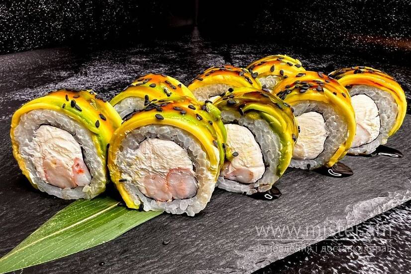 Рис, норі, сир Філадельфія, креветка тигрова, авокадо, кунжут, соус унагі.
