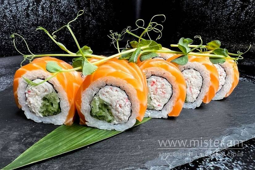 Рис, норі, огірок, сніжний краб, лосось свіжий, мікрогрін.