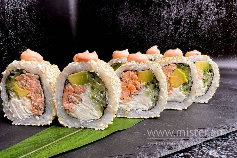 Рис, норі, кунжут, лосось смажений, сир Філадельфія, огірок, авокадо, соус спайсі.