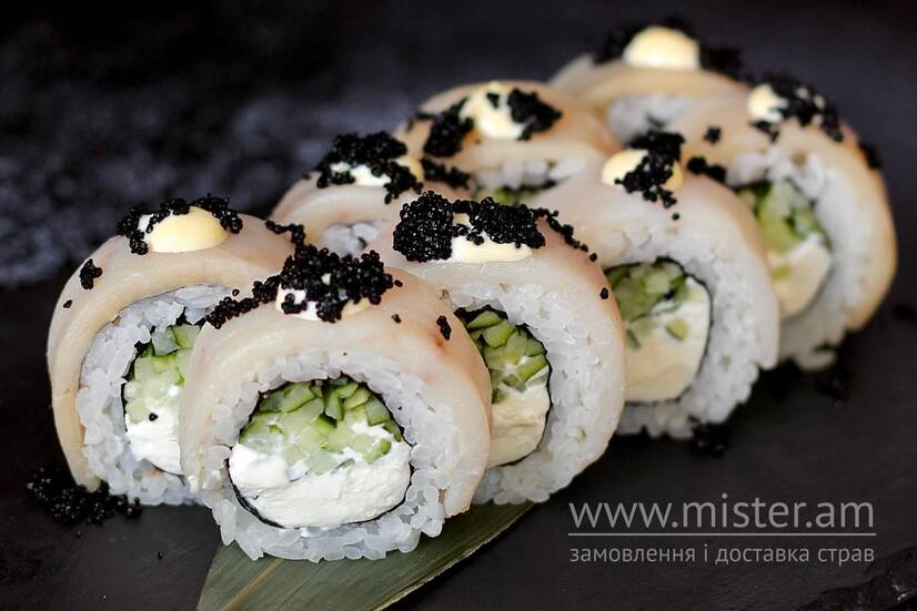 Рис, норі, сир Філадельфія, масляна копчена, огірок, японський майонез, ікра тобіко чорна.