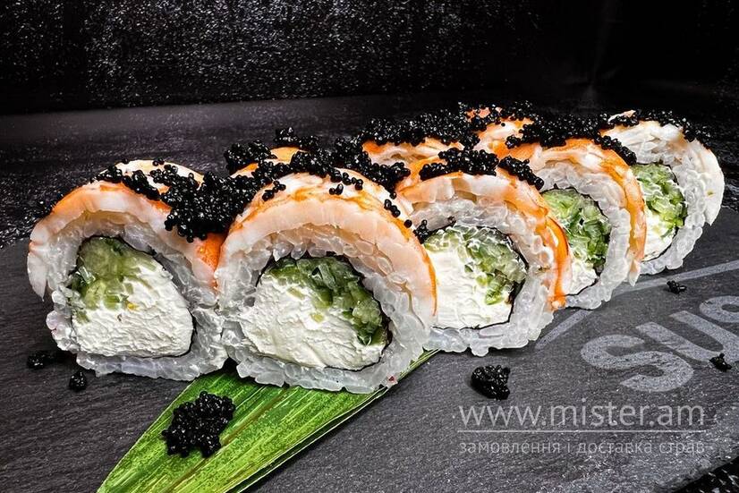 Рис, норі, сир Філадельфія, огірок, креветка тигрова, ікра чорна.