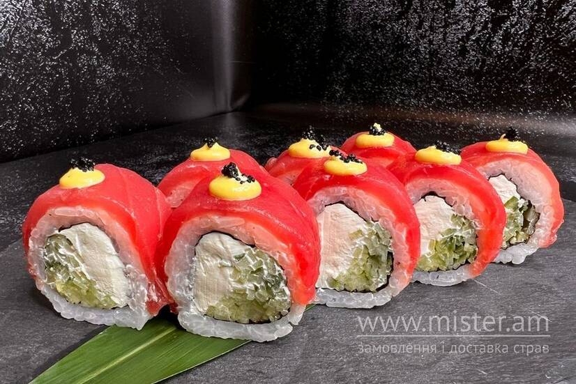 Рис, норі, сир Філадельфія, огірок, тунець, японський майонез, ікра чорна.