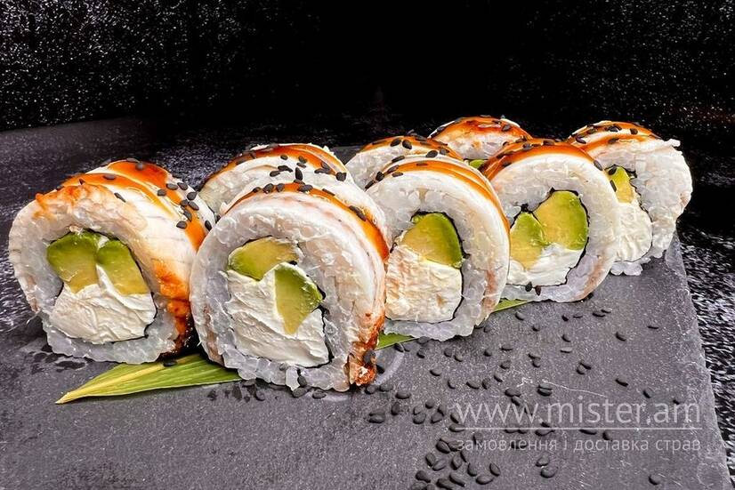 Рис, норі, сир Філадельфія, авокадо, вугор, соус Унагі, кунжут.
