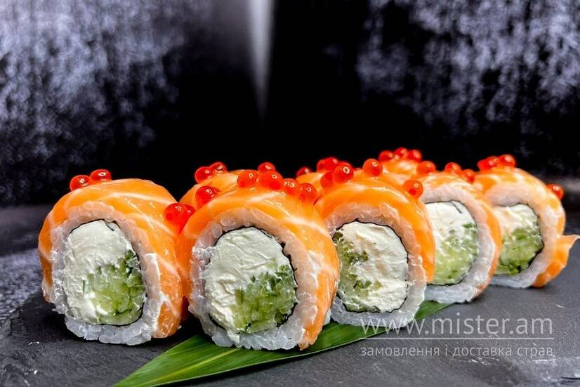 Рис, норі, сир Філадельфія, огірок, лосось свіжий, ікра імітація.