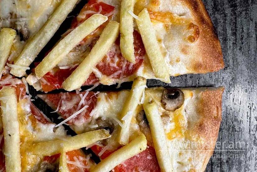 Тісто, томатний соус, сир твердий, печериці, сир пармезан, картопля фрі, салямі золотиста.