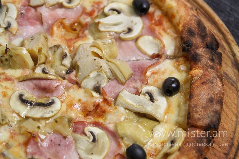 Соус Пелаті, моцарела, гауда, шинка, артишоки, печериці, маслини.