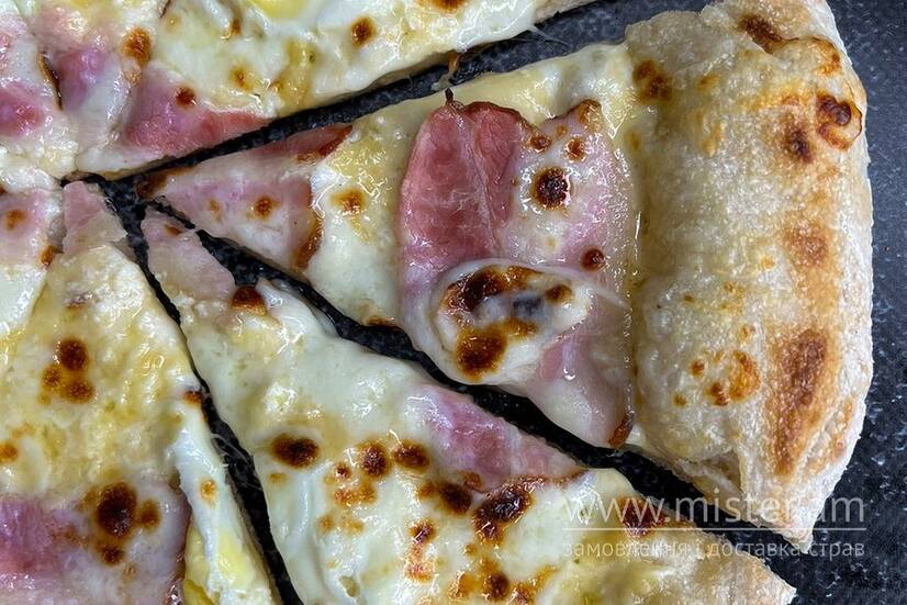 Тісто, вершковий соус, сир твердий, бекон, яйця перепелині, сир моцарела.