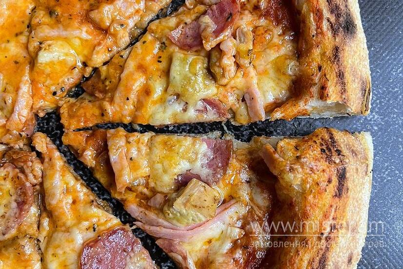 Тісто, соус томатний, сир твердий, салямі, шинка, куряче філе.