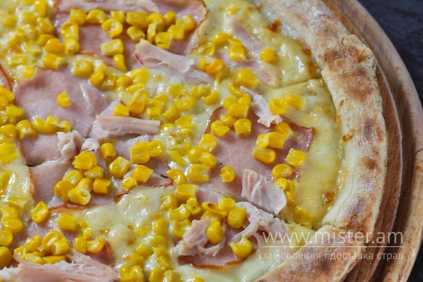 Вершковий соус, моцарела, гауда, шинка, куряче філе, кукурудза.