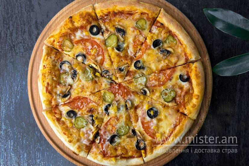 Тісто, соус томатний, помідори, огірки мариновані, гриби, кукурудза, маслини, сир твердий, сир моцарела.