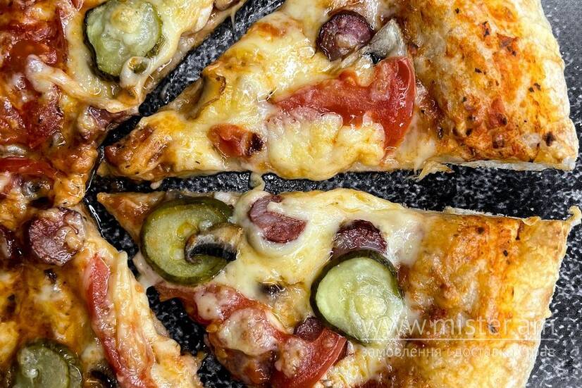 Тісто, соуст томатний, сир твердий, баварські ковбаски, печериці, помідори, огіркі мариновані.