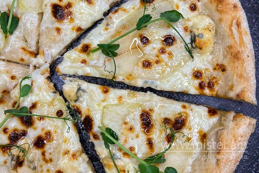Тісто, вершковий соус, сир моцарела, груша, сир горгонзола.