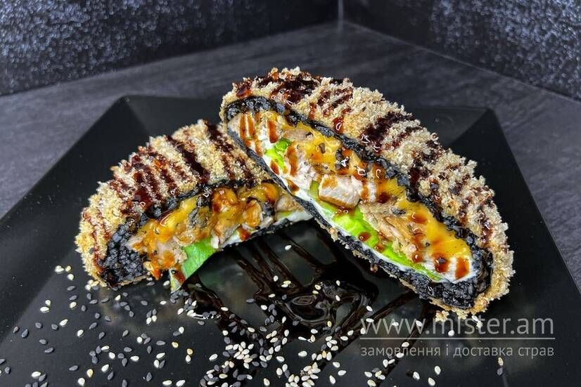 Рис, норі, чорнила каракатиці, куряче філе, сир чедер, салат айсберг, темпура.