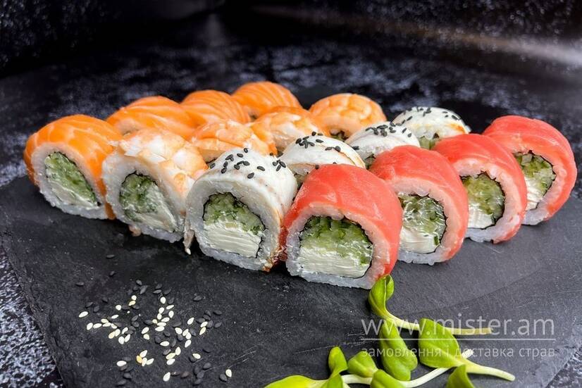 Філадельфія з лососем та креветкою, Філадельфія з вугрем та тунцем.