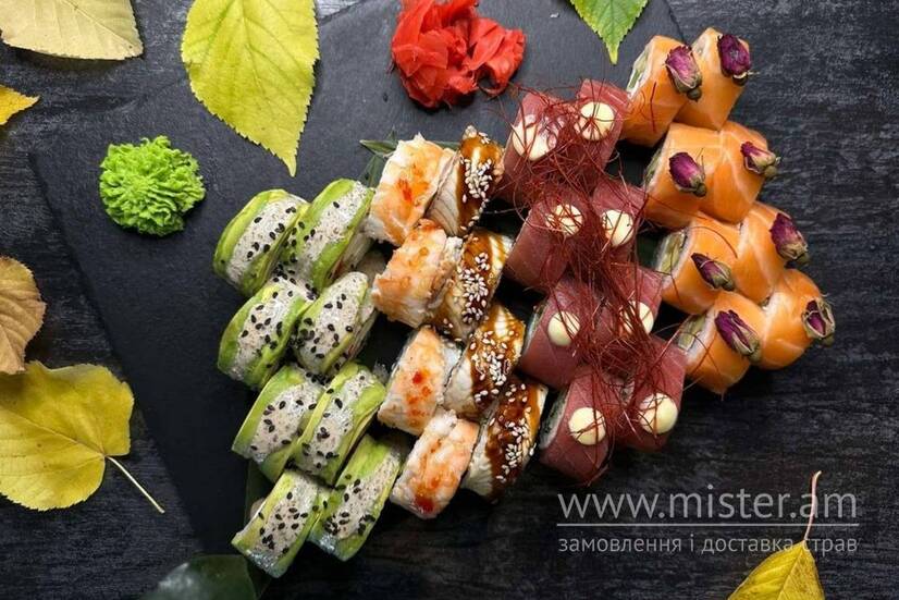 Філадельфія з тунцем, Філадельфія з лососем, Дуо рол з вугрем та креветкою, Філадельфія з креветкою та авокадо.