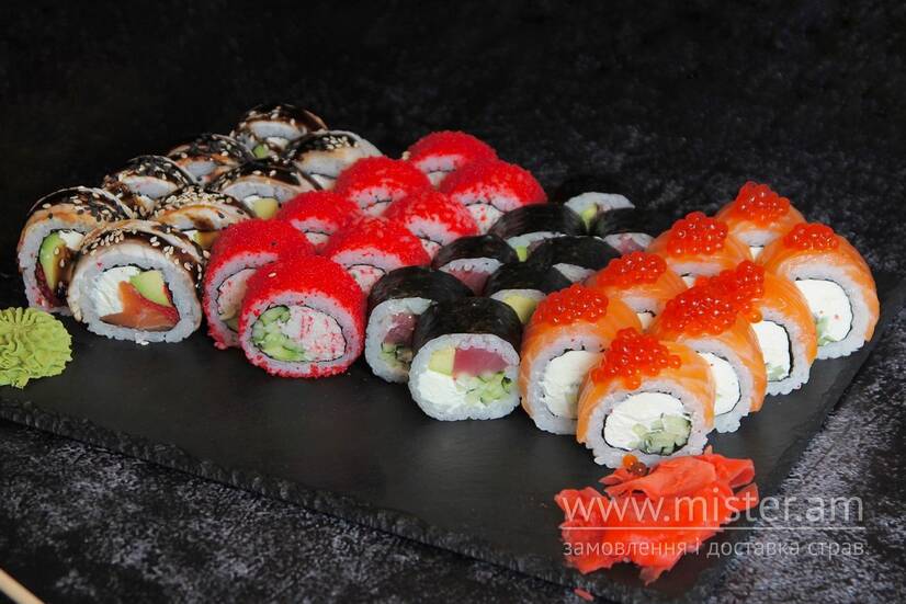 Золотий Дракон, Філадельфія зі свіжим лососем, Каліфорнія зі сніговим крабом, Футомак з тунцем.
