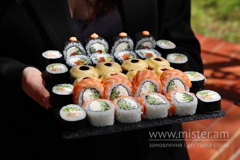 Філадельфія зі свіжим лососем, Філадельфія в чорному кунжуті з лососем, Футомак зі смаженим лососем, Чізумі з лососем.