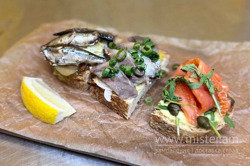 Великий шматок підсушеного хліба, розрізаний на 3 частини: слабосолений оселедець з гірчичним соусом та маринованою цибулею; шпроти з гострим томатним соусом, соленим огірком та тертим вареним яйцем; лосось власного засолу з соусом Цезар, листочками руколи і каперсами. Подається з лимоном.
