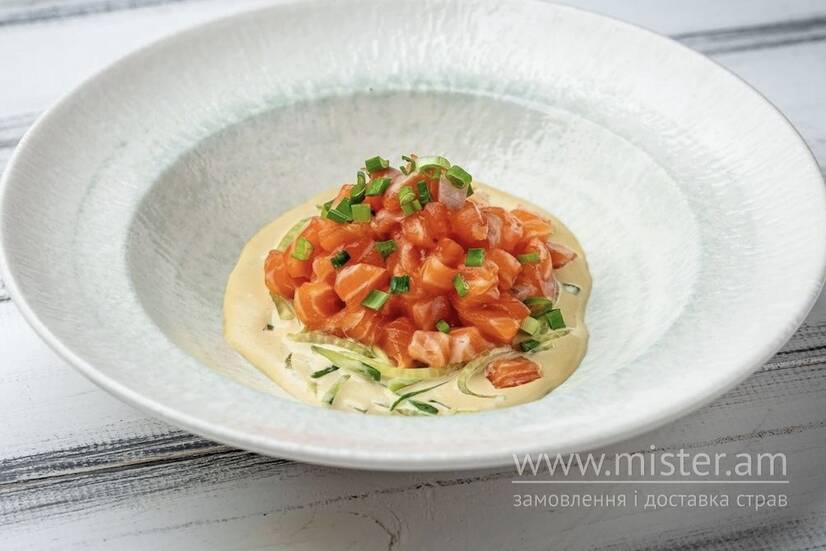 Філе лосося, нарізане кубиком з соусом на основі соєвого соуса, васабі та майонезу, подається зі свіжим огірком.