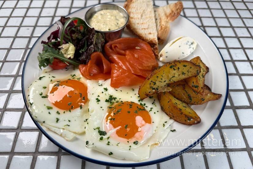 Філе лосося слабої солі, яєчня з двох яєць, смажена картопля, мікс салату з томатами чері, оливковою олією та горіхами, свіжий хліб, крем-сир, вершкове масло, соус тар-тар.