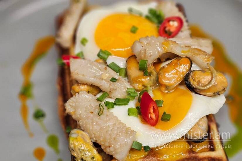 Оката яєчня на картопляній вафлі зі смаженим кальмаром та м'ясом мідій