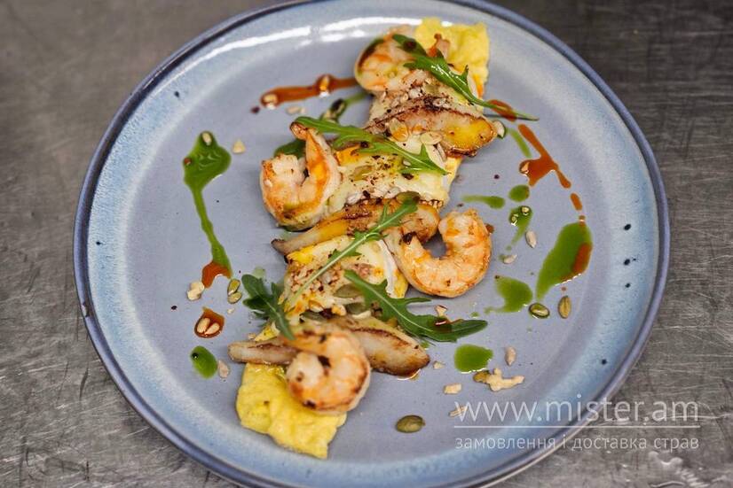 Ніжний омлет з двох яєць на вершковому маслі. Подаємо з обсмаженими хвостами тигрових креветок, слайсами карамелізованої груші та прогрітим горілкою до золотистої скоринки сиром Брі. Прикрашаємо руколою, горіховим міксом, червоною та зеленою олією.