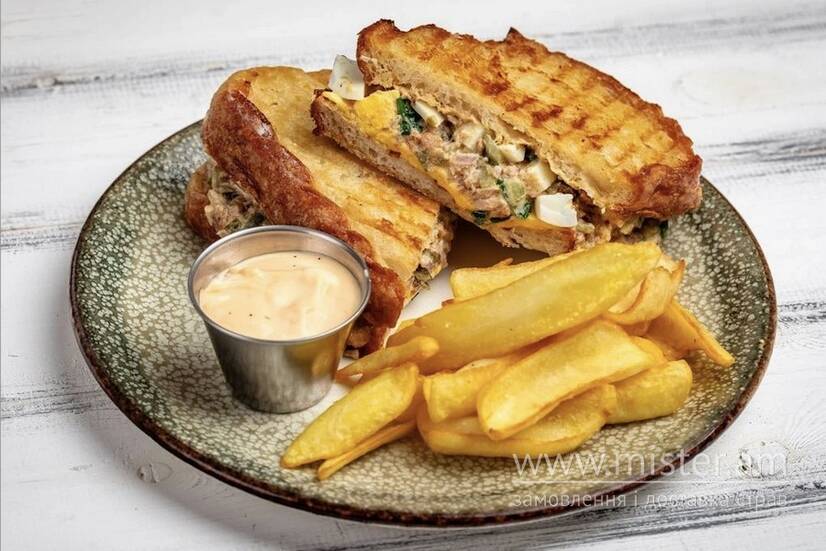 Консервований тунець з додаванням відвареного яйця, червоної цибулі, каперсів та маринованих корнішонів у підсмаженому хрусткому хлібі. Подається з картопляними діпами та кунжутним соусом чилі.