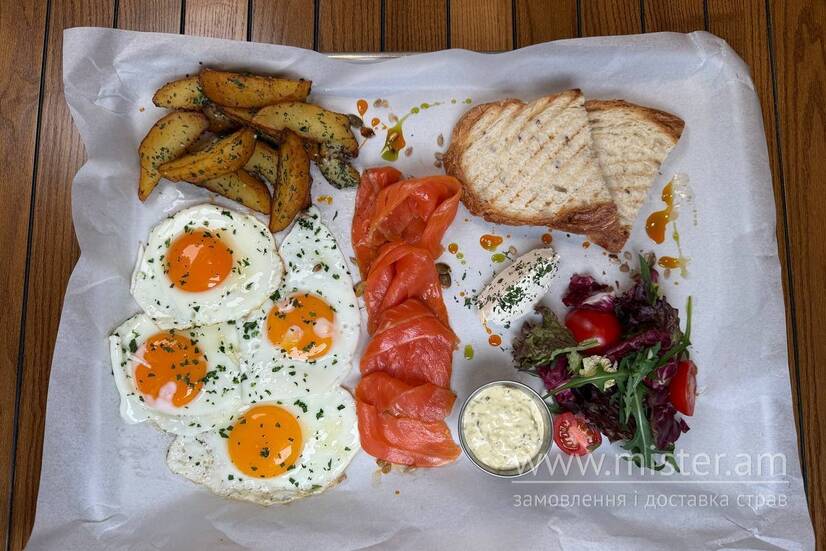 Філе лосося слабкої солі, яєчня з чотирьох яєць, смажена картопля, мікс салату з томатами чері, оливковою олією та горіхами, свіжий хліб, крем-сир, соус тар-тар.
