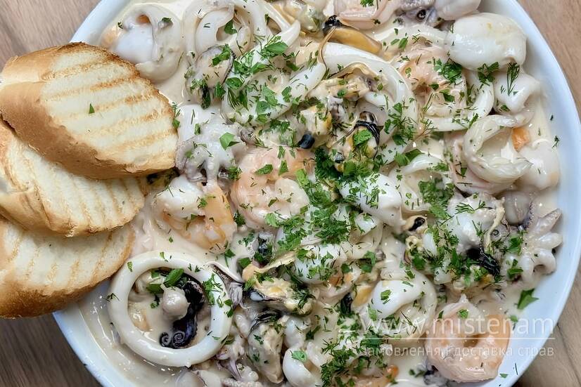 Кальмар атлантичний, м`ясо мідій, хвости тигрових креветок, бебі-кальмар, бебі-восьминіг, бебі-каракатиця тушковані у вершковому соусі. Подаємо з грінками з багету, прикрашаємо зеленню.