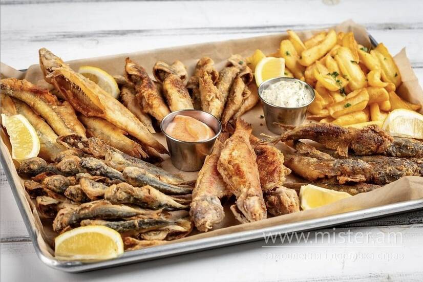 Смажена у борошні риба: барабуля атлантична, барабуля чорноморська, бичок, ставрида, корюшка. Подаємо з картопляними діпами, соусами тартар і айолі з кімчі, лимоном та зеленню.