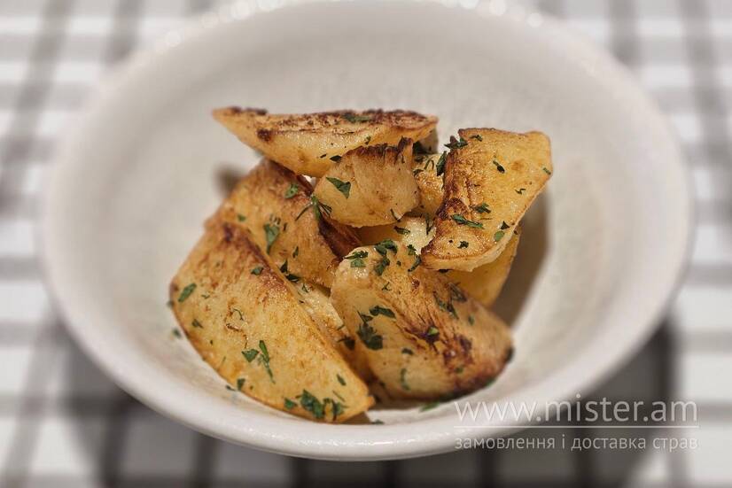 Хрустка смажена картопля з додаванням часнику та зелені.