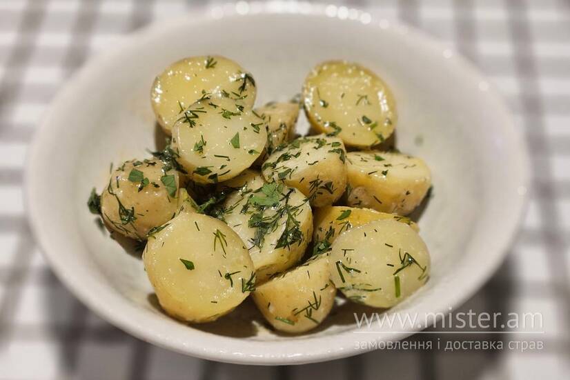 Відварну картоплю готуємо з вершковим маслом та часниковою пастою. Посипаємо кропом.