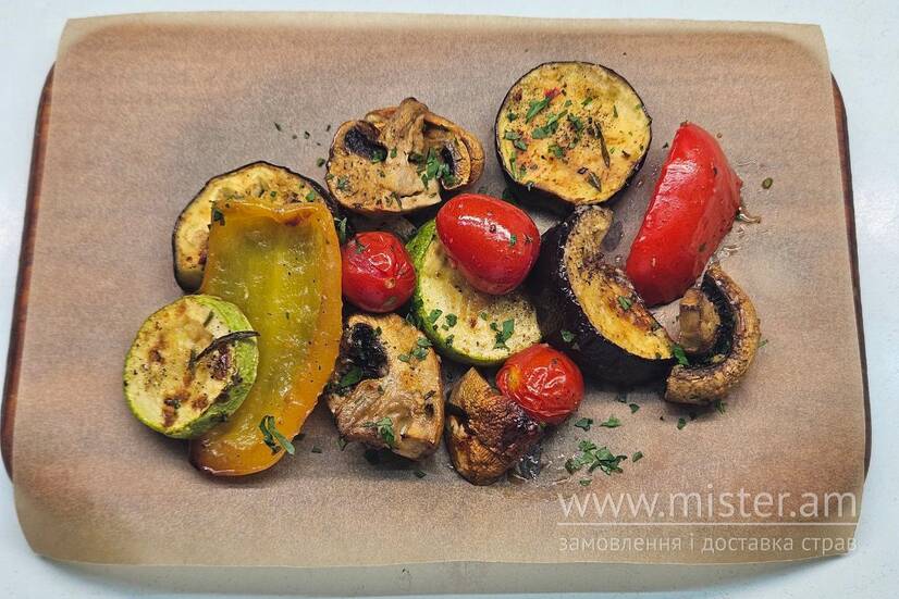 Мариновані кабачок,баклажан, печериці, болгарський перець, цибуля рібчаста, помідор обсмажені на грилі.