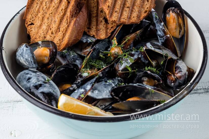 Чилійські мідії в мушлях, що готуються в соусі на основі вершків, білого вина, цибулі смаженої, часнику та солі. Подаємо з трьома шматочками багету та лимоном. Прикрашаємо петрушкою.