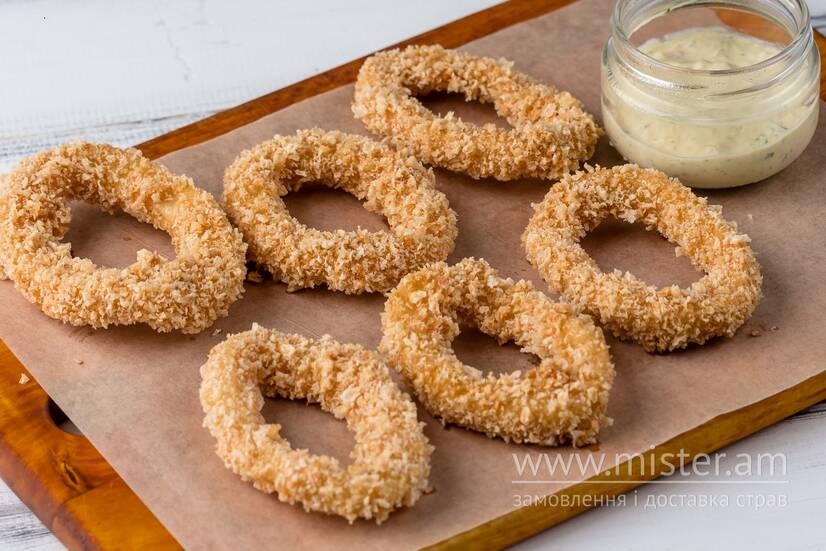 Кільця атлантичного кальмару в паніровці з яйця, борошна та сухарів панко, обсмажені у фритюрі. Подаються з соусом тар-тар.