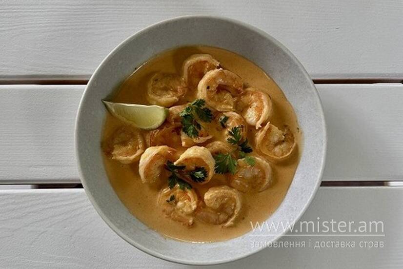 Креветки обсмажуємо на оліі з додаванням білого вина і солі та тушкуємо у соусі по-тайськи (соус на основі вершків та пасти Том Ям, з додаванням кокосового молока, солі, цукру та петрушки) з додаванням вершкового масла. При подачі прикрашаємо шматочком лайма та гілочкою кінзи.