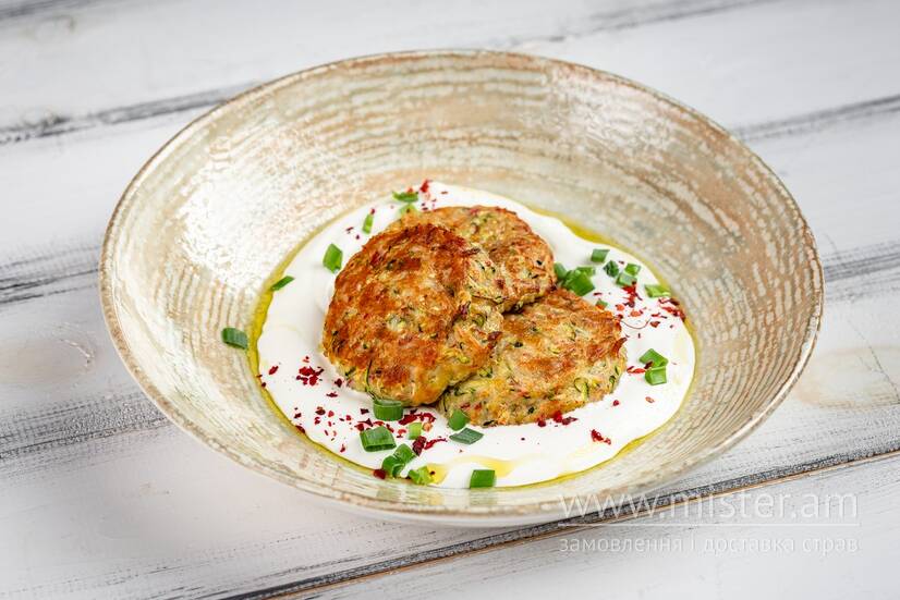 Котлети з молодого кабачка, крабового м`яса, крабових паличок і твердого сиру, подаються з пряною сметаною з пластівцями перцю чилі, зеленою цибулею та оливковою олією.