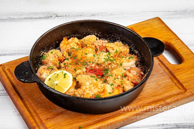 Хвости креветок з білим вином і пряним вершковим маслом, запечені під скоринкою з пармезану та хрумких сухарів панко.