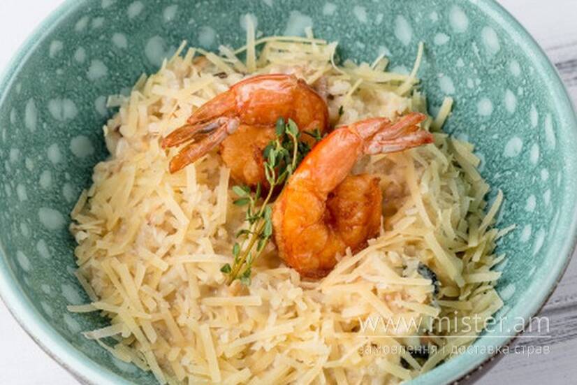 Рис Арборіо, тушкований у вершковому соусі, з додаванням ріпчастої цибулі,часнику, сиру Пармезан та вершкового масла, а також обсмажених морепродуктів: м`ясо мідій, восьминіг бебі, кальмар атлантичний. Прикрашається тертим сиром Пармезан та обсмаженими хвостами тигрової креветки.